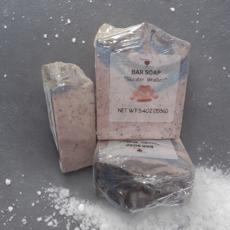 Sweater Weather bar soap scent is a mix of mint, fruit and oak moss. It makes you want to curl up with a blanket and read a good book! Sweater Weather is gentle on your skin to offer a gentle clean for regular use. Soap includes oats for a mild exfoliation.
